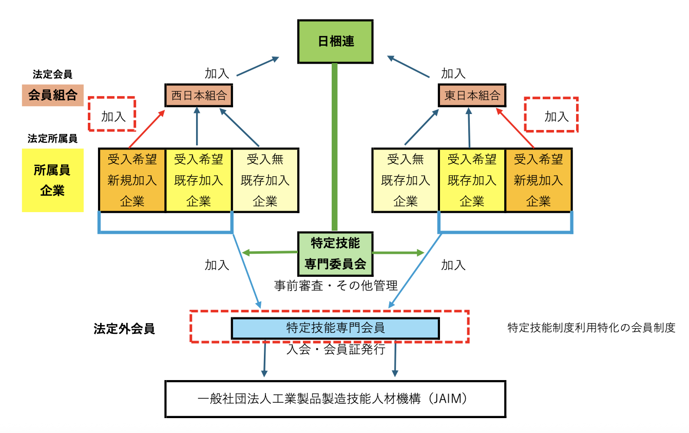 2.日梱連は、東日本梱包工業組合(以下「東組合」とする。)と西日本梱包工業組合(以下「西組合」とする。)の上部団体であり、日梱連に所属することとは、東組合並びに西組合への企業加入が必須条件であるが、特定技能外国人材受け入れ希望事業者は、事前に日梱連特定技能専門委員会の審査(本文4項参照)合格の上、東西組合に加入することとする。